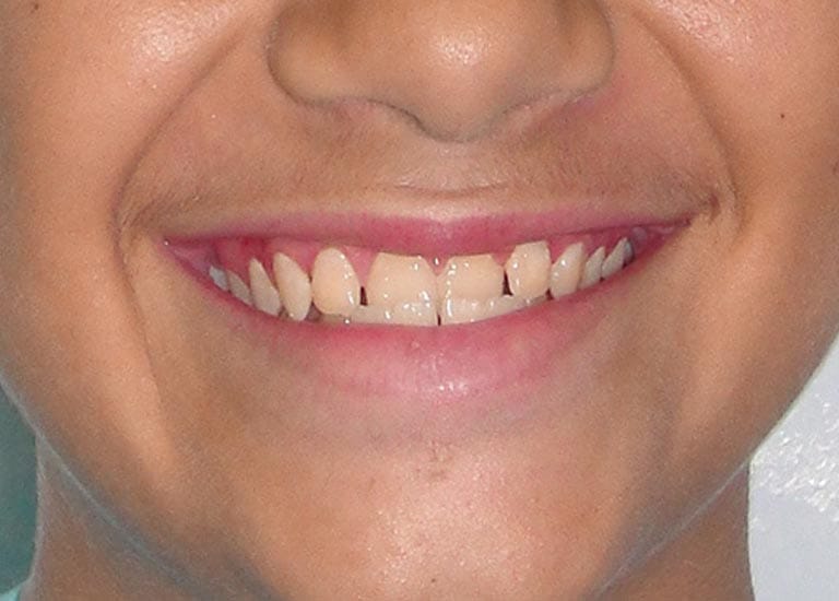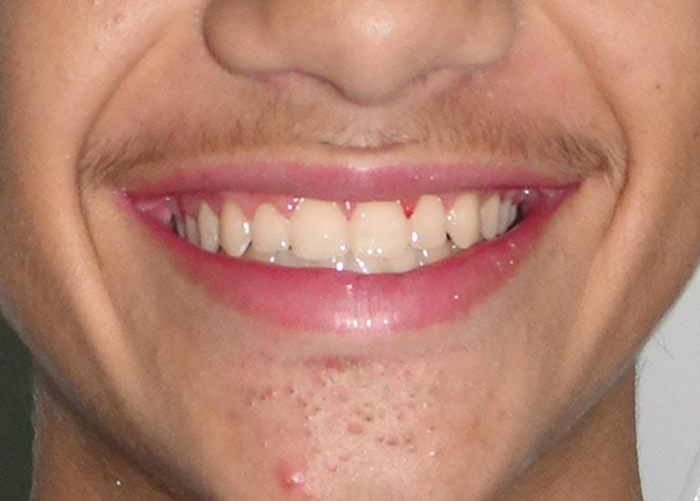 راجعني والد هذا الشاب الصغير بعد أن لاحظ الأهل وجود تراجع واضح في أسنان ابنهم الأمامية العلوية، كما أن الشاب نفسه لم يكن راضياً عن ابتسامته.
