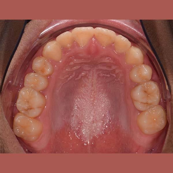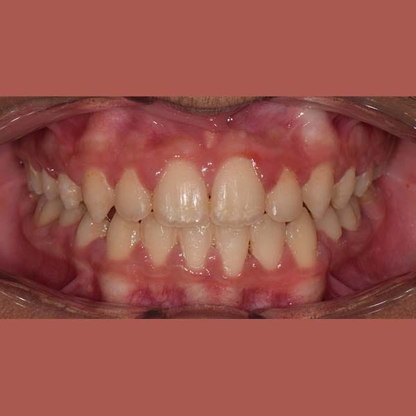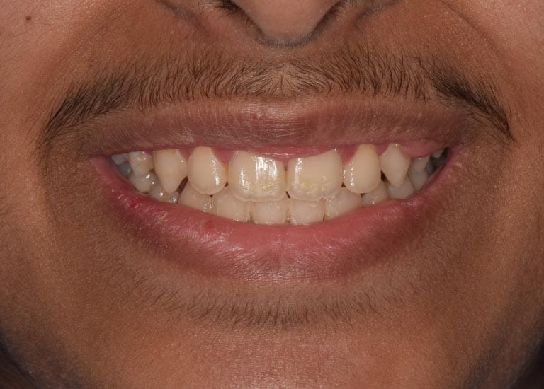 بعد فحص الشاب، وجد الدكتور خالد الكاتب أنه يعاني من عضة معكوسة أمامية وازدحام شديد لدرجة أن أحد الأسنان كان موجوداً بالكامل خارج القوس السني. كانت الخطة العلاجية تتطلب توفير مساحة، لذا تم قلع سن واحد فقط من الفك العلوي وآخر من الفك السفلي. بعد ذلك، تم تركيب تقويم الأسنان لمدة 20 شهراً لحل الازدحام وتصحيح العضة المعكوسة.