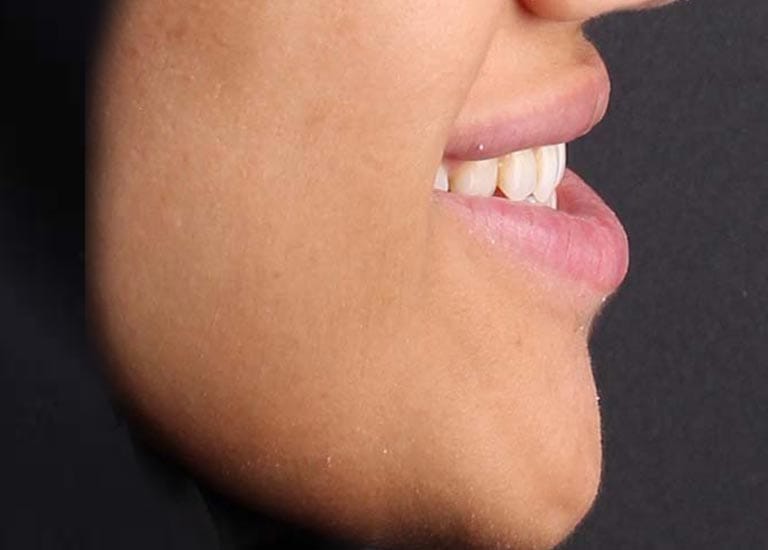 كما تظهر الصور، كانت النتيجة تحولاً كاملاً. تم استعادة الشكل الطبيعي للذقن والفك السفلي، وتم تصحيح العضة المعكوسة. في النهاية، أصبح بإمكان مراجعتنا الشابة أن تستمتع بابتسامة مميزة وواثقة وملامح وجه متناغمة.