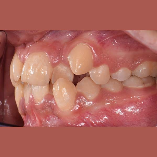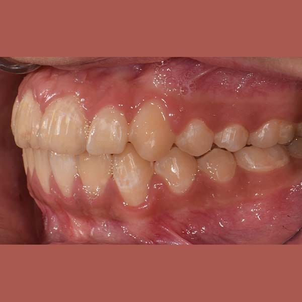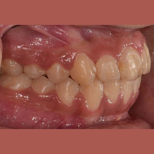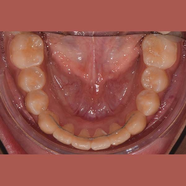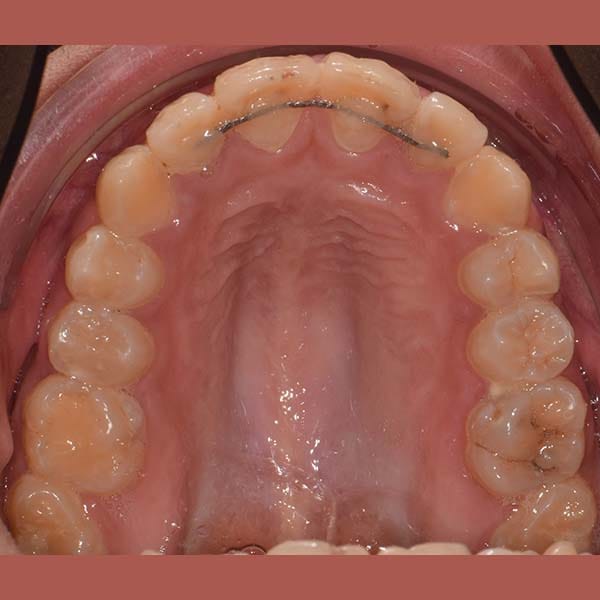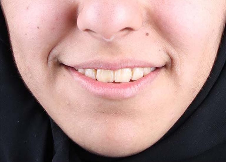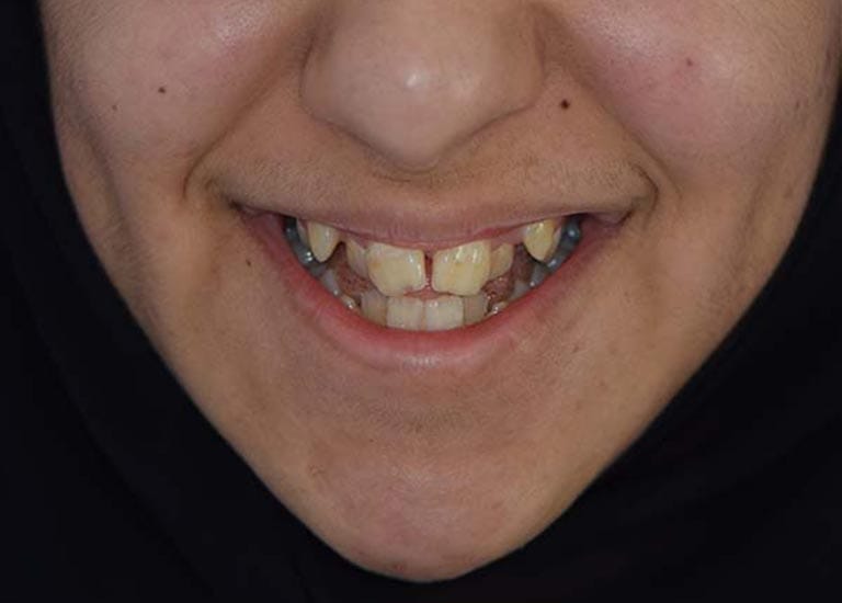 “راجعتني والدة هذه الآنسة الشابة طالبة أي حل لتحسين ابتسامة ابنتها ولكن دون الاضطرار لقلع أي من أسنانها. أخبرتها أن قلع الأسنان أحياناً يكون ضروري جداً لتصحيح الابتسامة، ولكن لحسن الحظ، في حالة ابنتها كان العلاج دون قلع الأسنان أمرا ممكنا، عن طريق توسيع الفكين وفتح مسافة لرصف الأسنان. استخدمت تقويم الدايمون الذي يعتبر ملائما لهذا النوع من المعالجات.