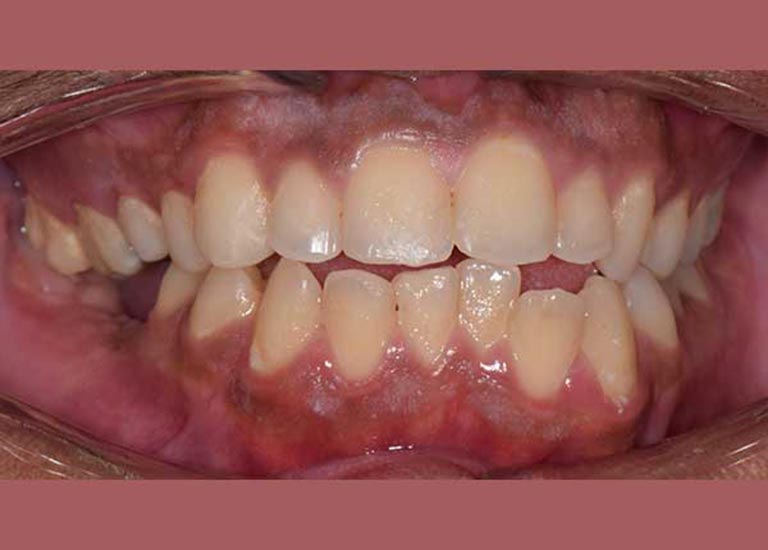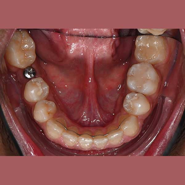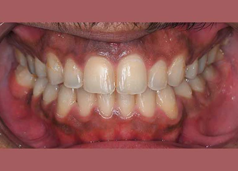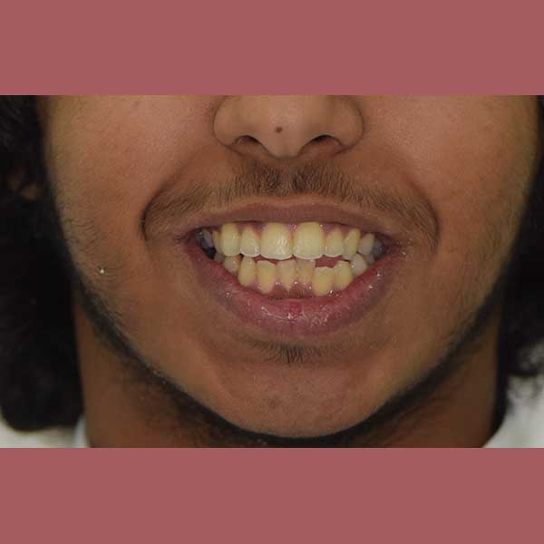 كان المراجع يعاني من عضة معكوسة أمامية، حيث كانت أسنانه السفلية تتقدم على أسنانه العلوية. هذا الوضع لم يكن يسبب فقط مظهراً غير مرغوب فيه للابتسامة، بل أيضاً صعوبة حقيقية في مضغ الطعام.