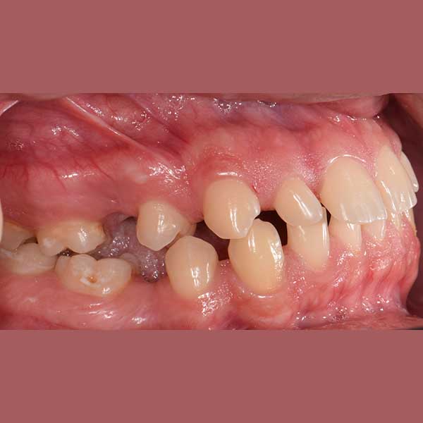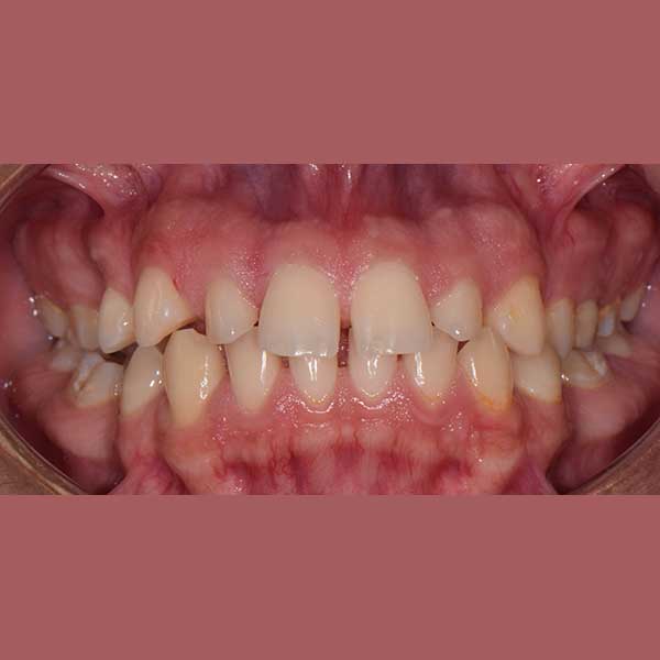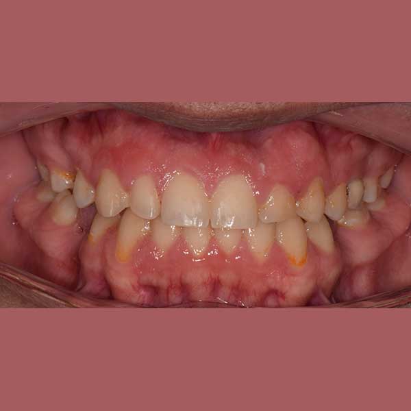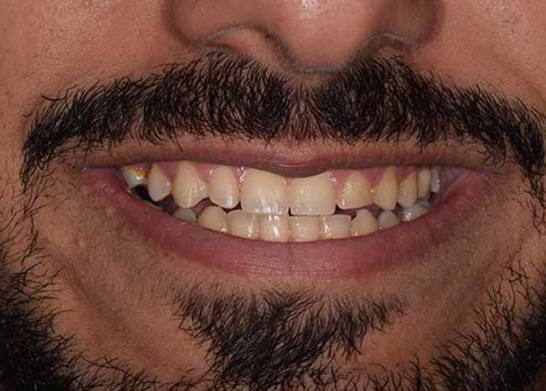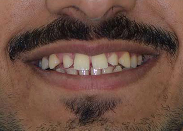 My friend here has suffered from the early loss of some permanent back teeth, which led to the creation of spaces between the front teeth and the inability to place dental implants to replace the missing teeth due to the small spaces between the front teeth.